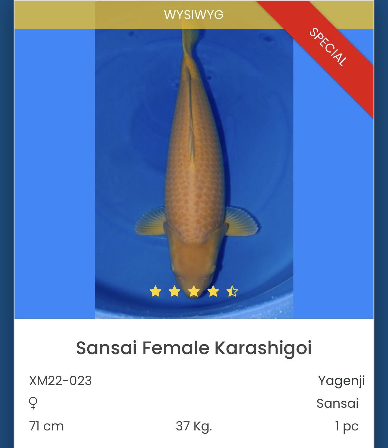 Den råsete Koien som blir impotert i år er den her Karashigoien fra Yagenji koi farm, denne kommer med Konishi blod linjer som er blant de største i verden. Den er bare 2,5år 2023 og allerede 71cm så den har et godt utgangspunkt til og bli over 1meter.